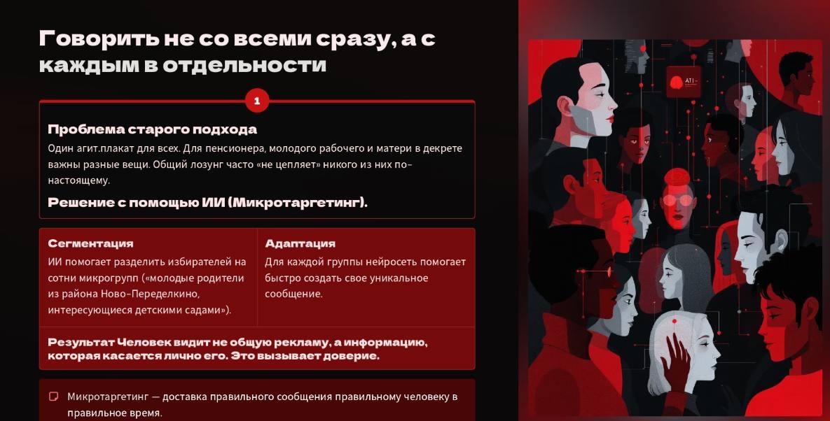 In the 2024 Moscow elections, one candidate did just that: he created 150 different messages for 150 buildings in his district. Each building had its own problem: a leaky roof here, a playground that wasn’t being repaired there. And each building received a leaflet specifically about its problem. The result? Turnout increased by 34%. That’s what precision means.
