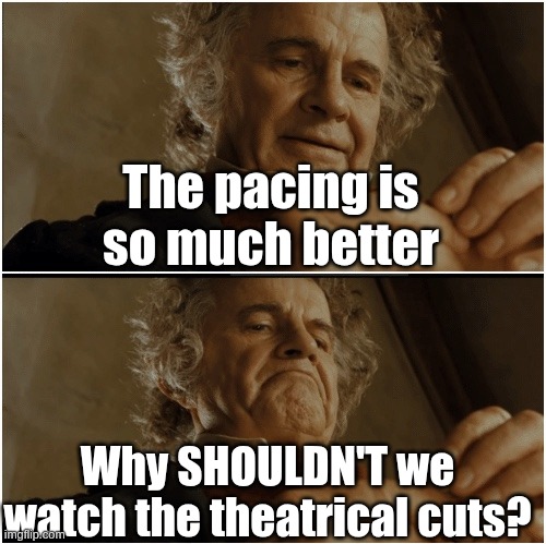 I prefer the extended versions every time, but there are a few scenes here & there that do slow down the pacing a bit. However, the “Concerning Hobbits” intro to hobbits and The Shire at the beginning of Fellowship should have absolutely been included in the theatrical version. It sets the stage so much better and really drives home just how much of an idyllic life the hobbits are forced to leave behind.
