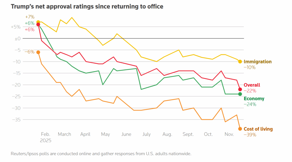 - Trump’s approval rating in 2025, based on indicators of immigration, economy, and cost of living. Photo: Reuters-IPSOS